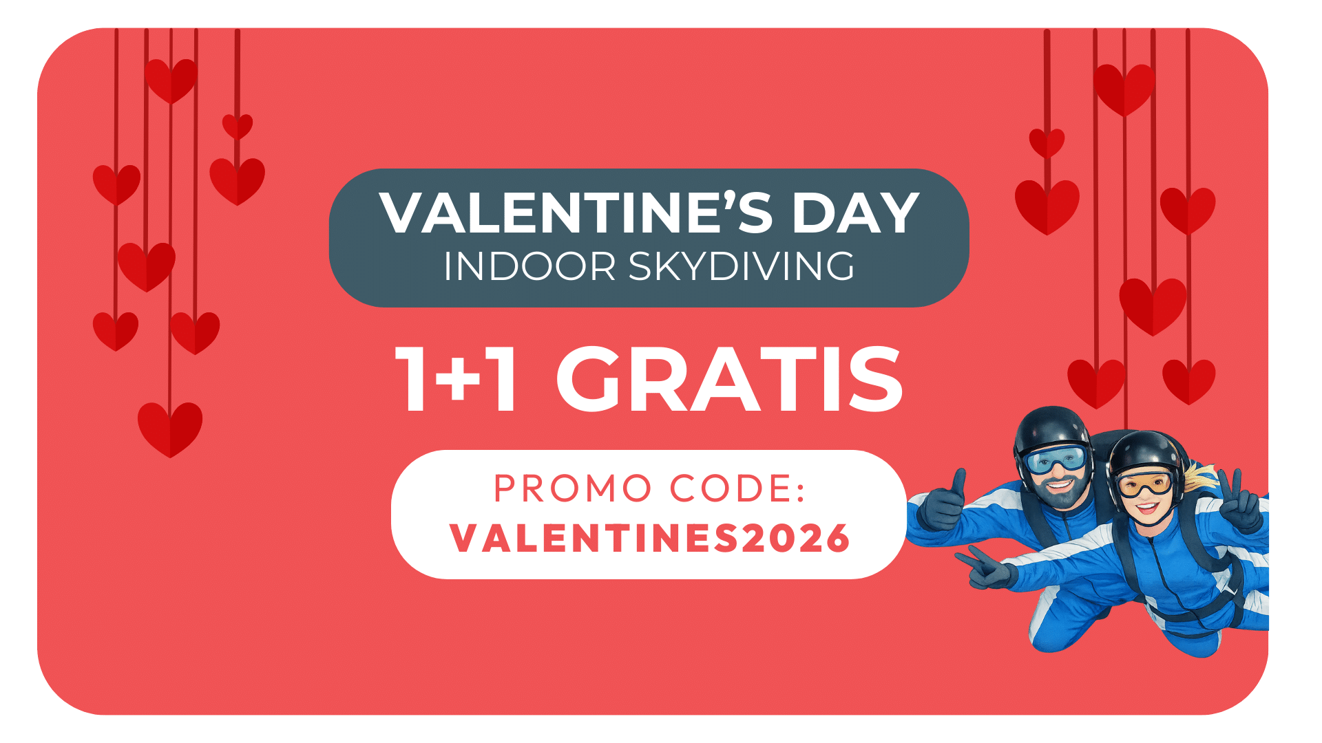 Koop een Indoor Skydiving-pack en de tweede is gratis dankzij onze speciale Valentijnsactie.